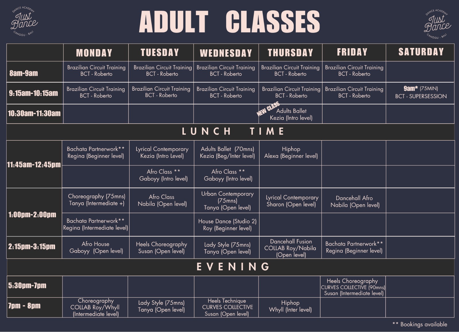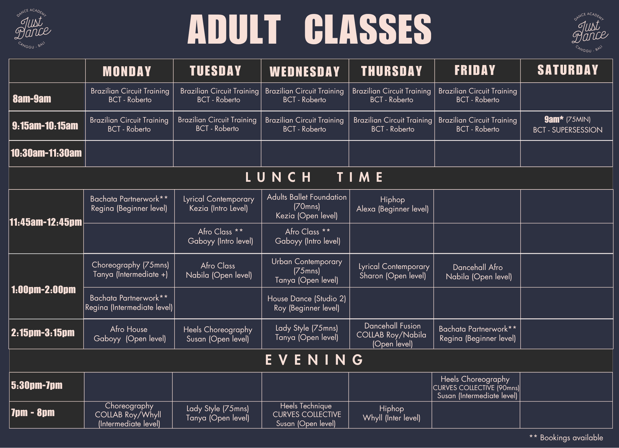 For all other adults classes, we don’t take bookings, please come before class starts and register at reception